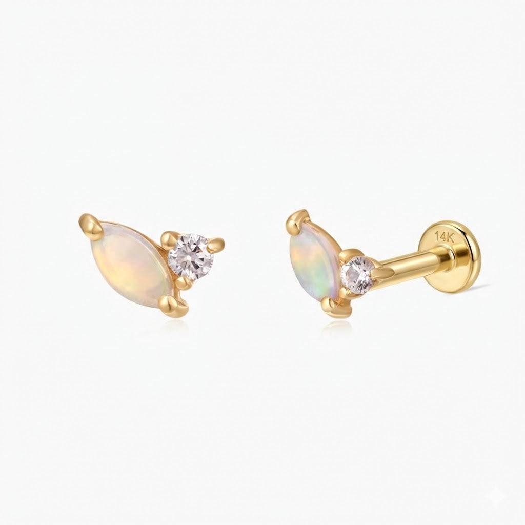 14K Solid Yellow Gold Marquise Opal Flat Back Stud & Solid Gold Post